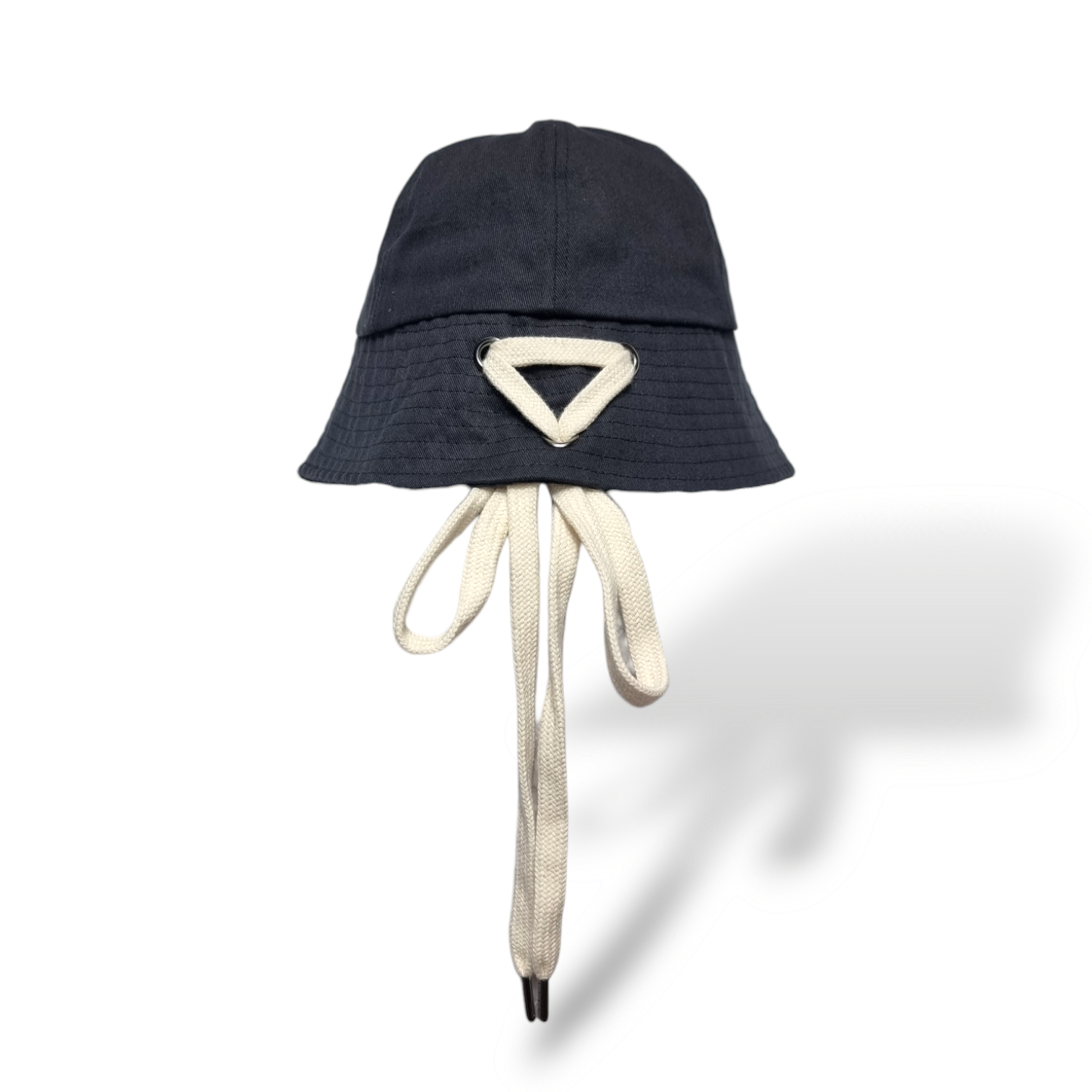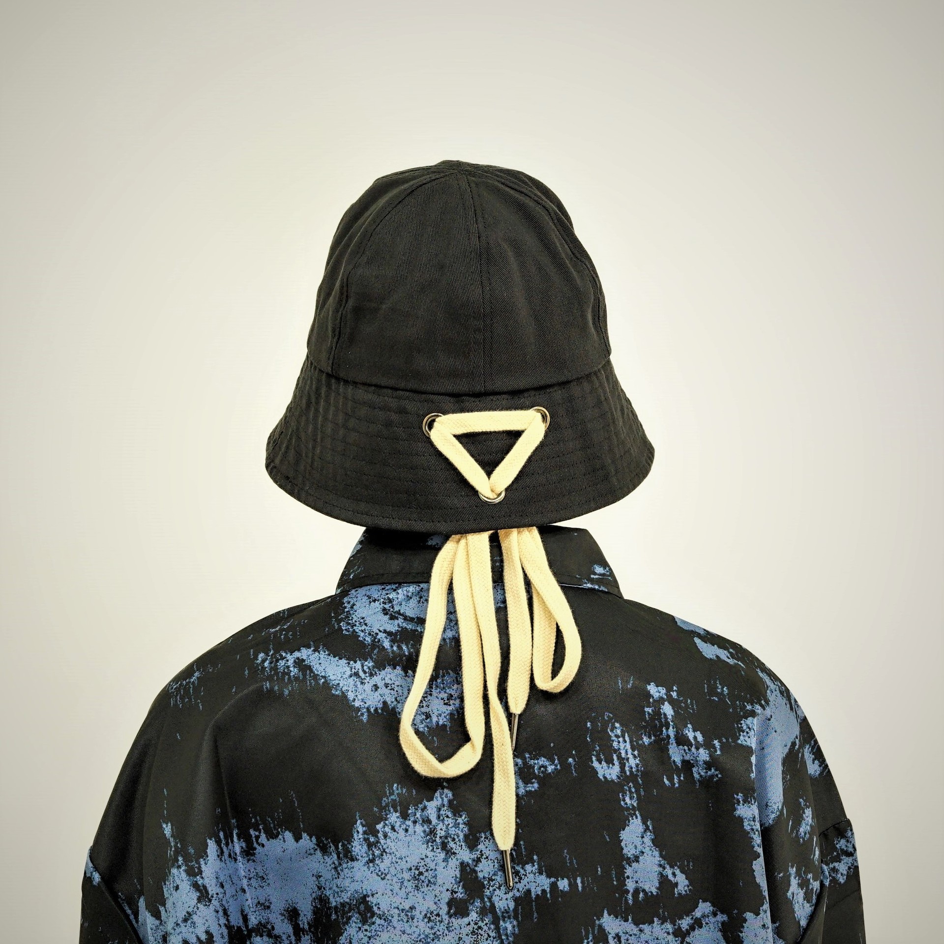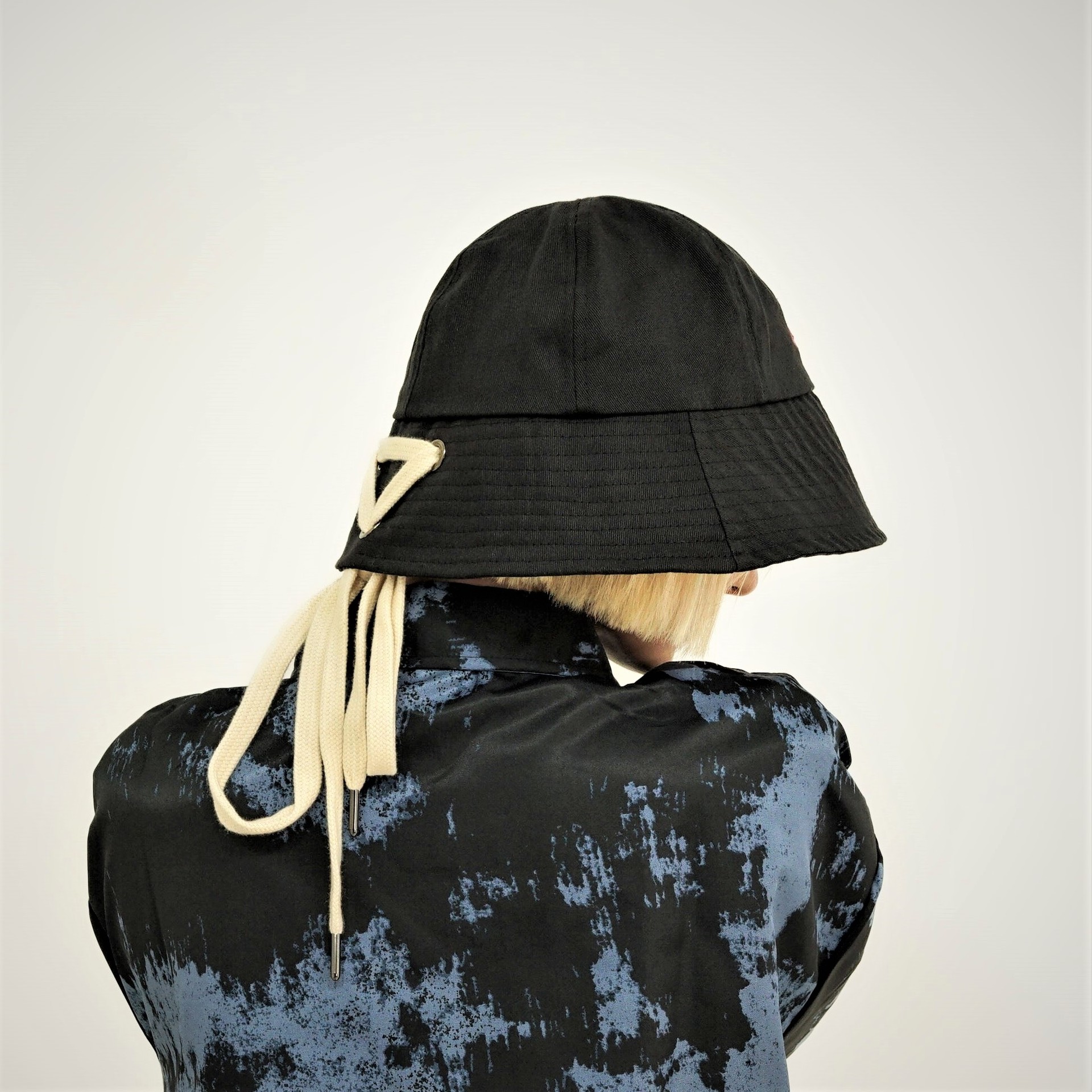 깊고 내려간 긴 챙으로 시크한 무드를 살릴 수 있는 아웃핏의 코튼 버킷햇입니다